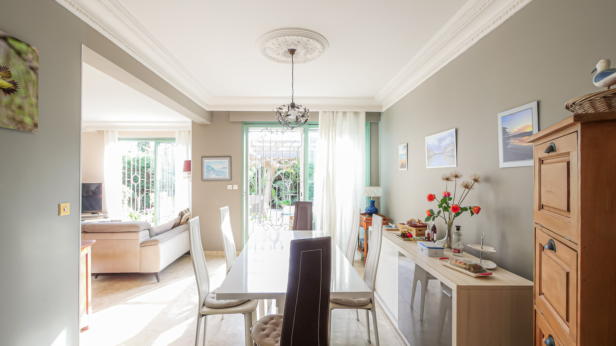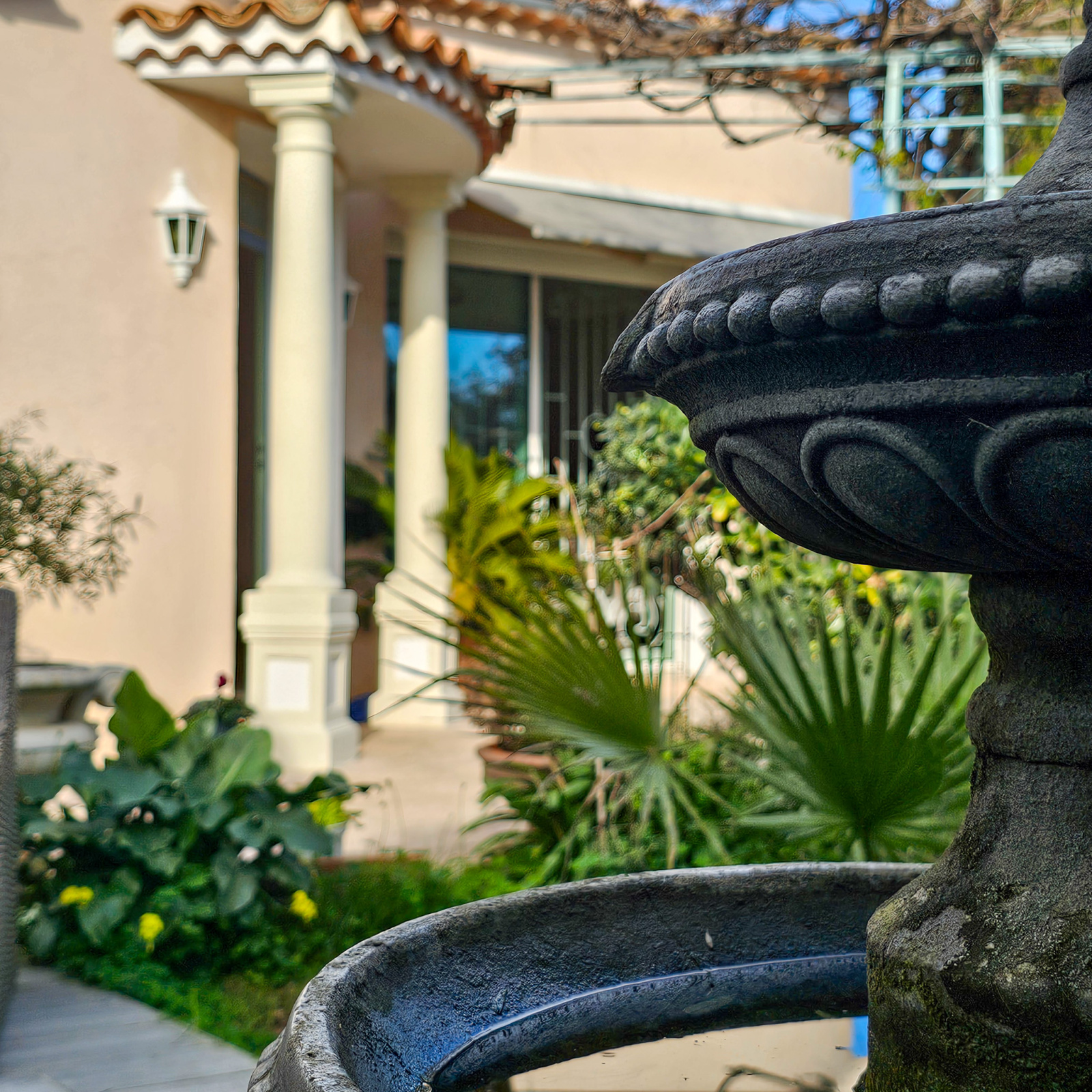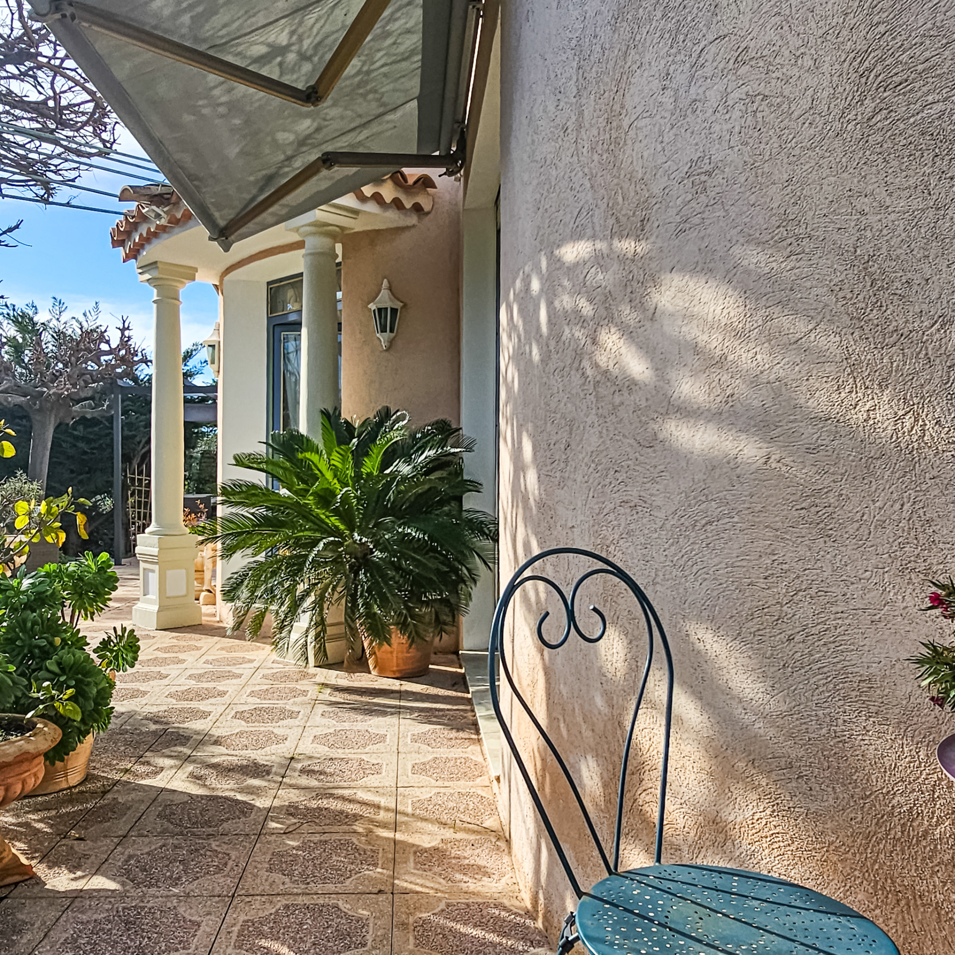 Située dans une rue calme du centre-ville de Hyères, à proximité du Casino et du cours Maintenon, cette villa T4 d’environ 100 m² de plain-pied se distingue par une architecture de caractère, inspirée d’un registre classique assumé.