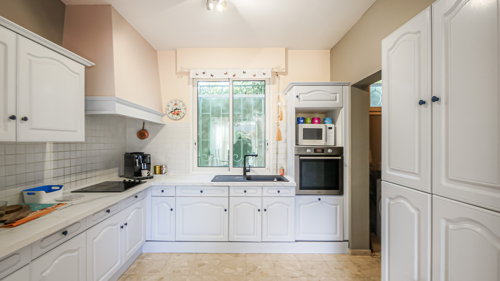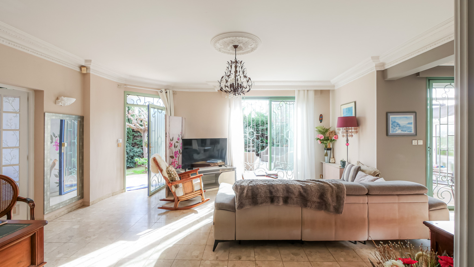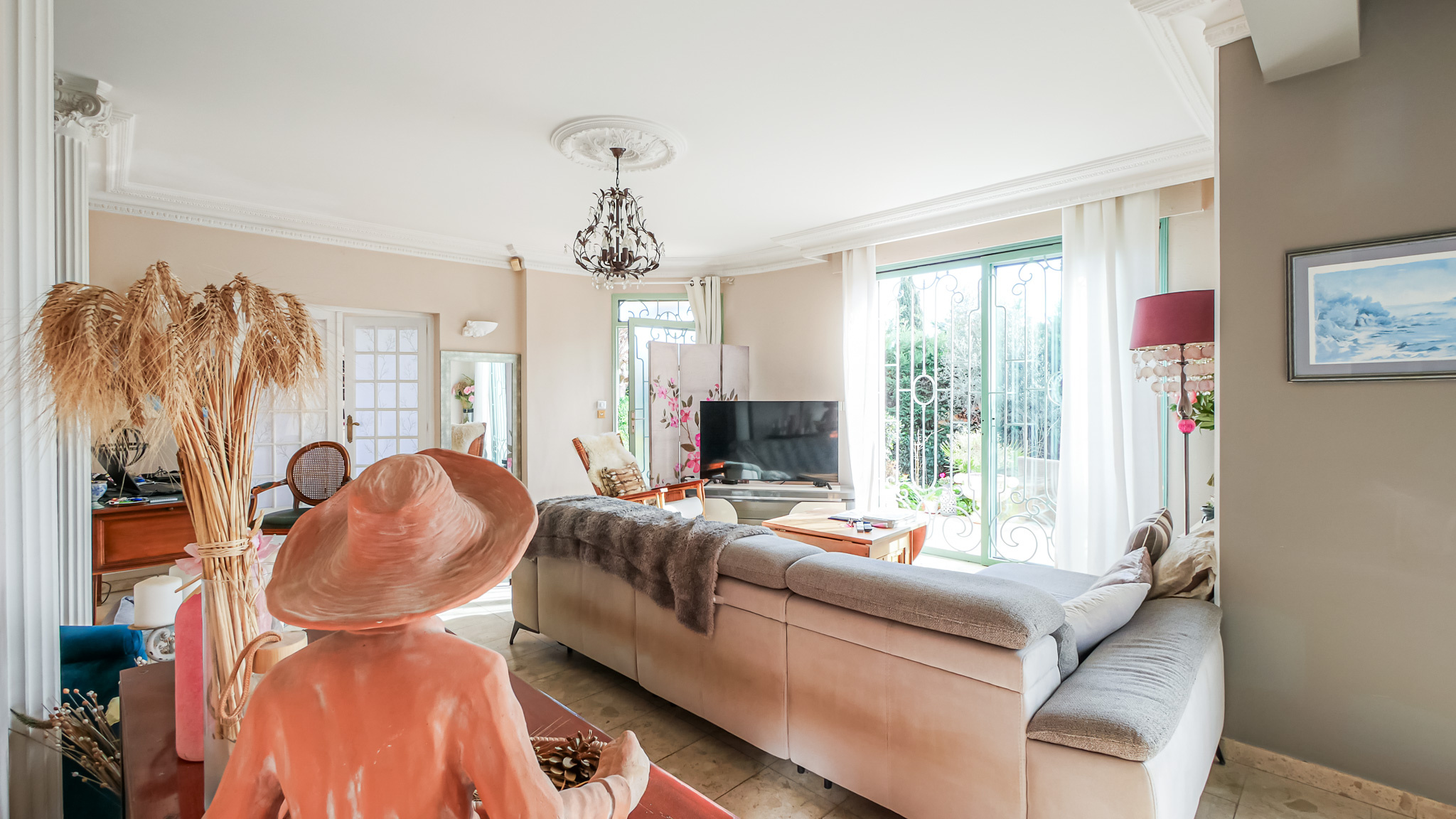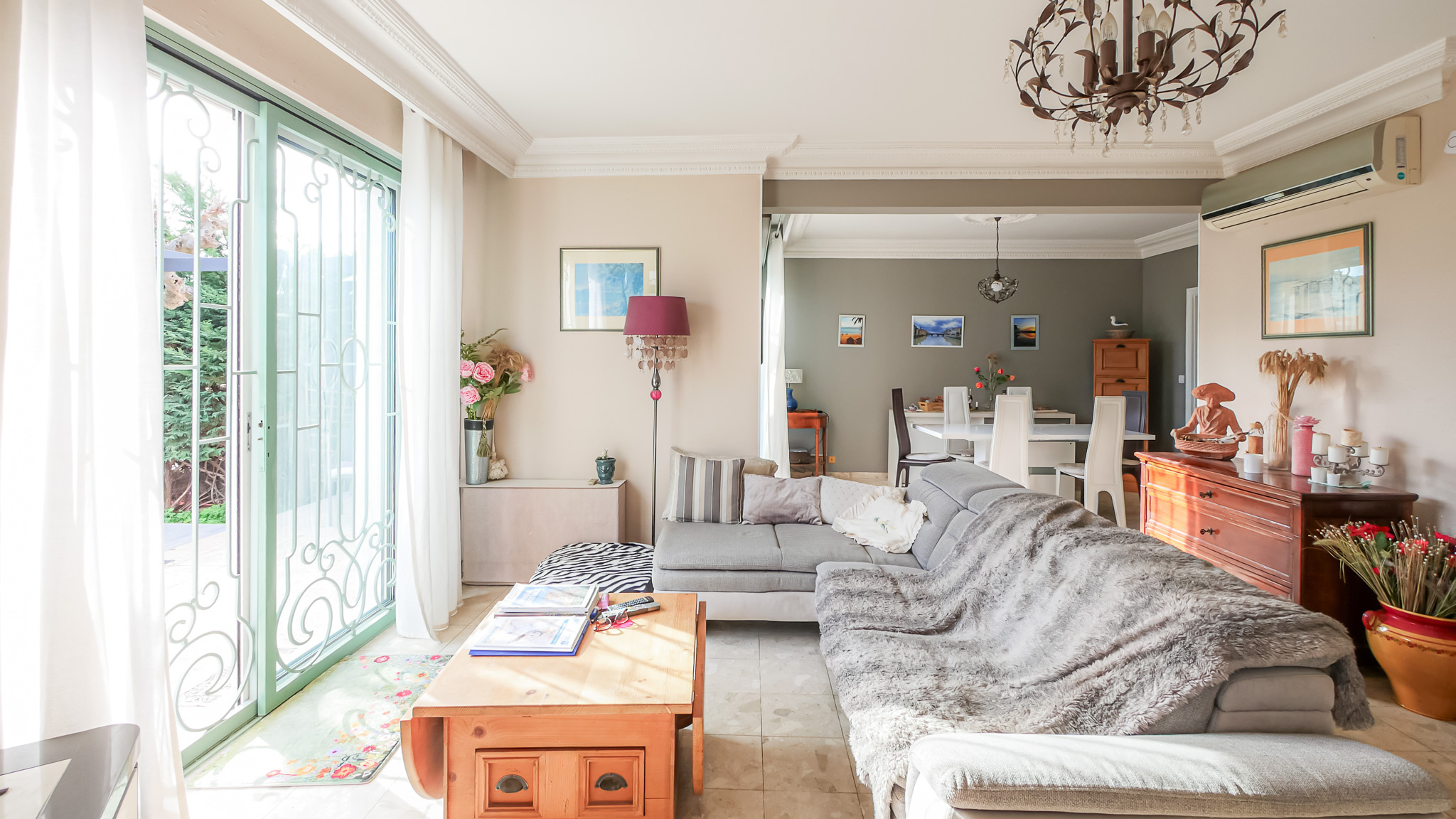 Située dans une rue calme du centre-ville de Hyères, à proximité du Casino et du cours Maintenon, cette villa T4 d’environ 100 m² de plain-pied se distingue par une architecture de caractère, inspirée d’un registre classique assumé.