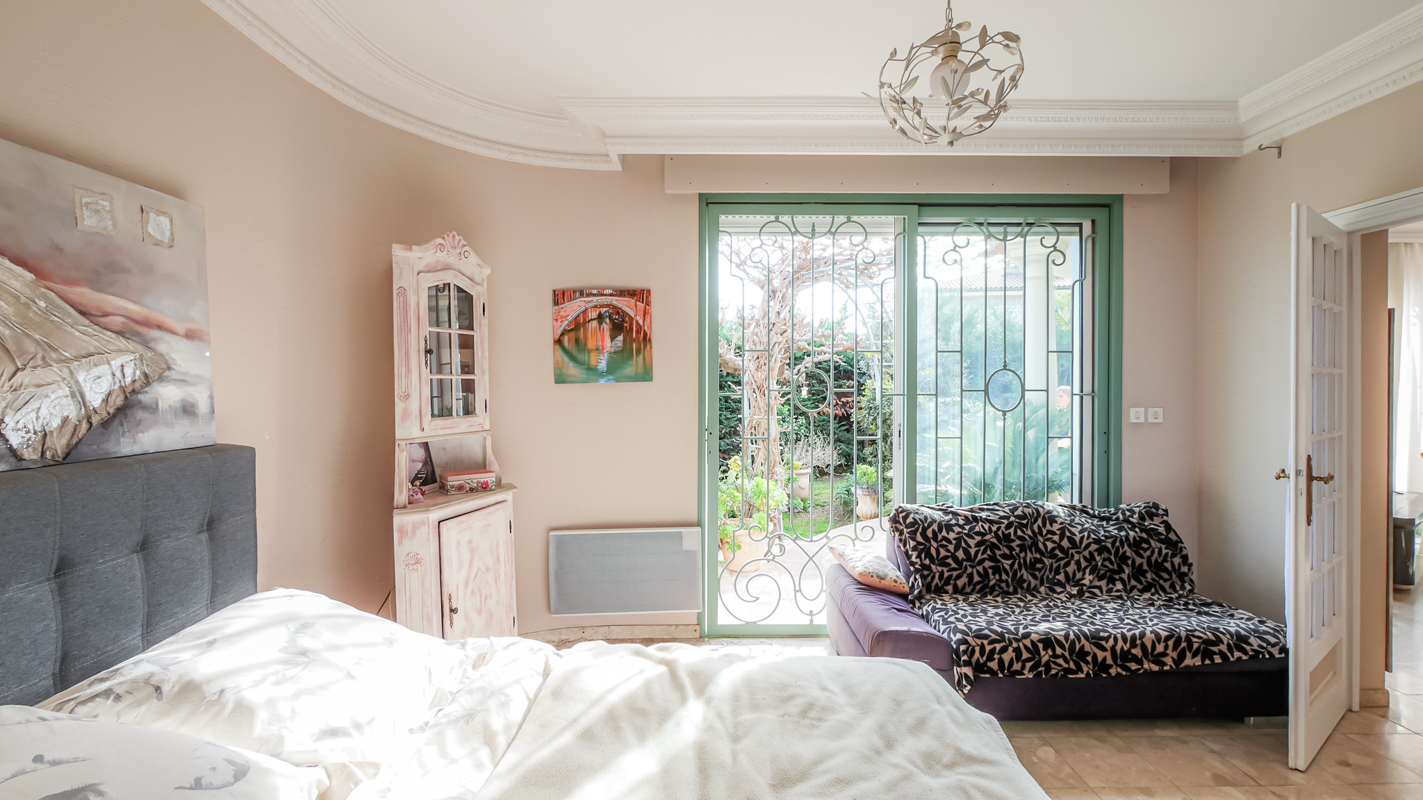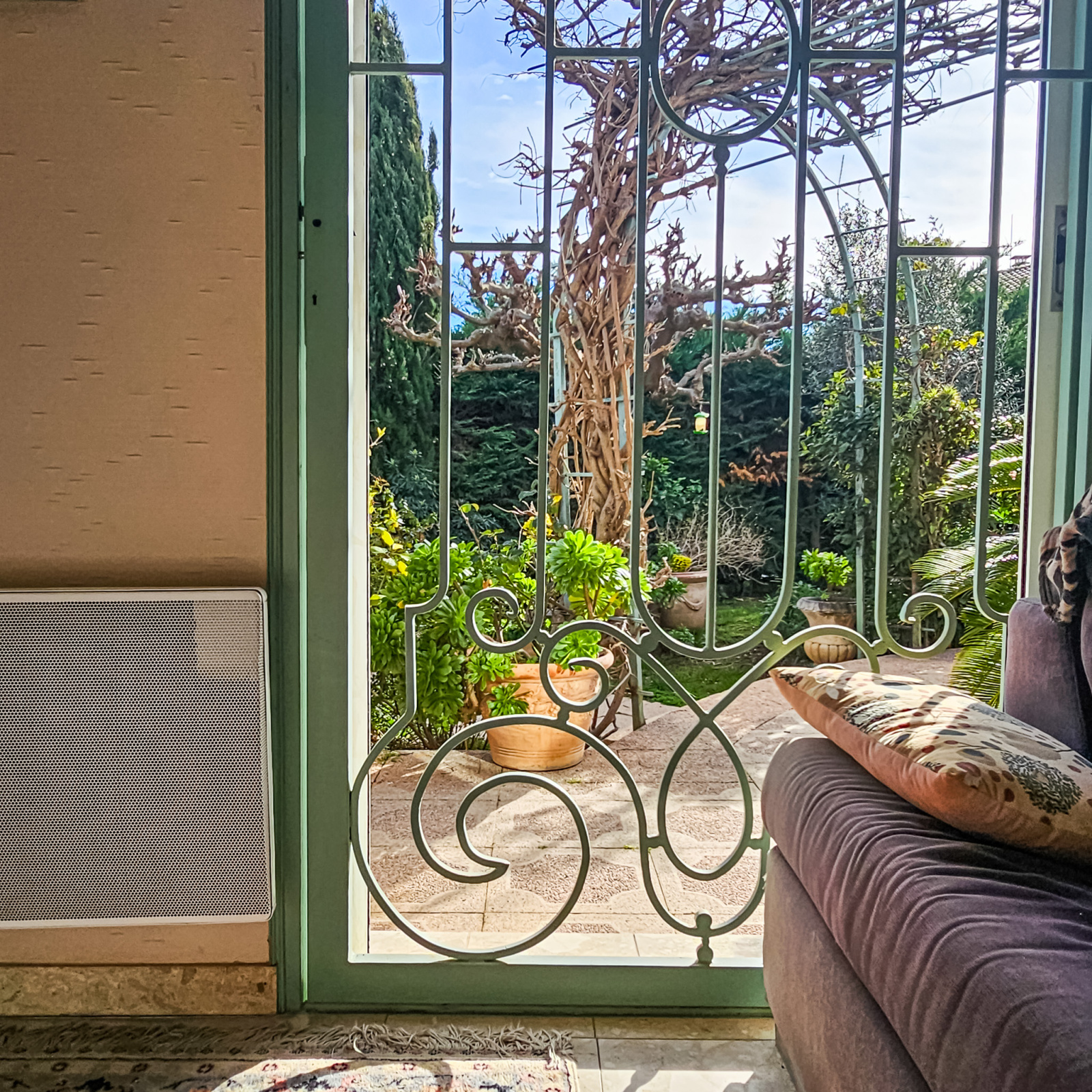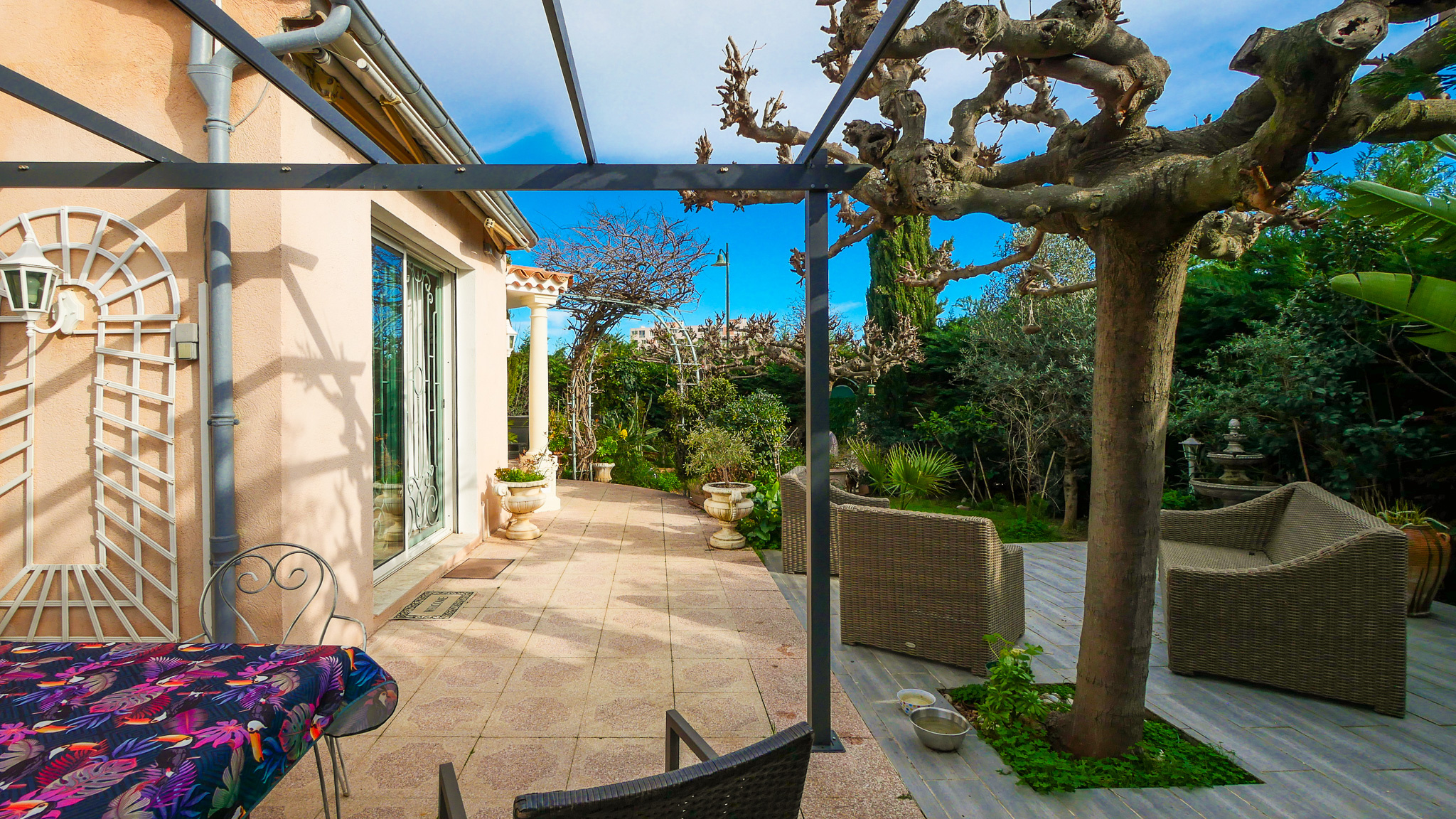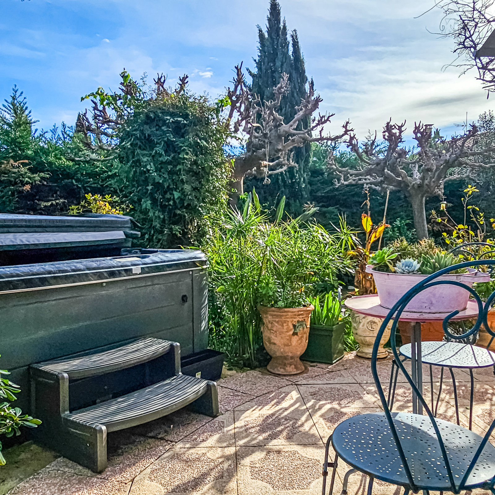 Le jardin intimiste, aménagé avec des essences méditerranéennes, dispose d’une terrasse, d’une pergola et d’un jacuzzi, offrant un cadre de vie préservé en cœur de ville.