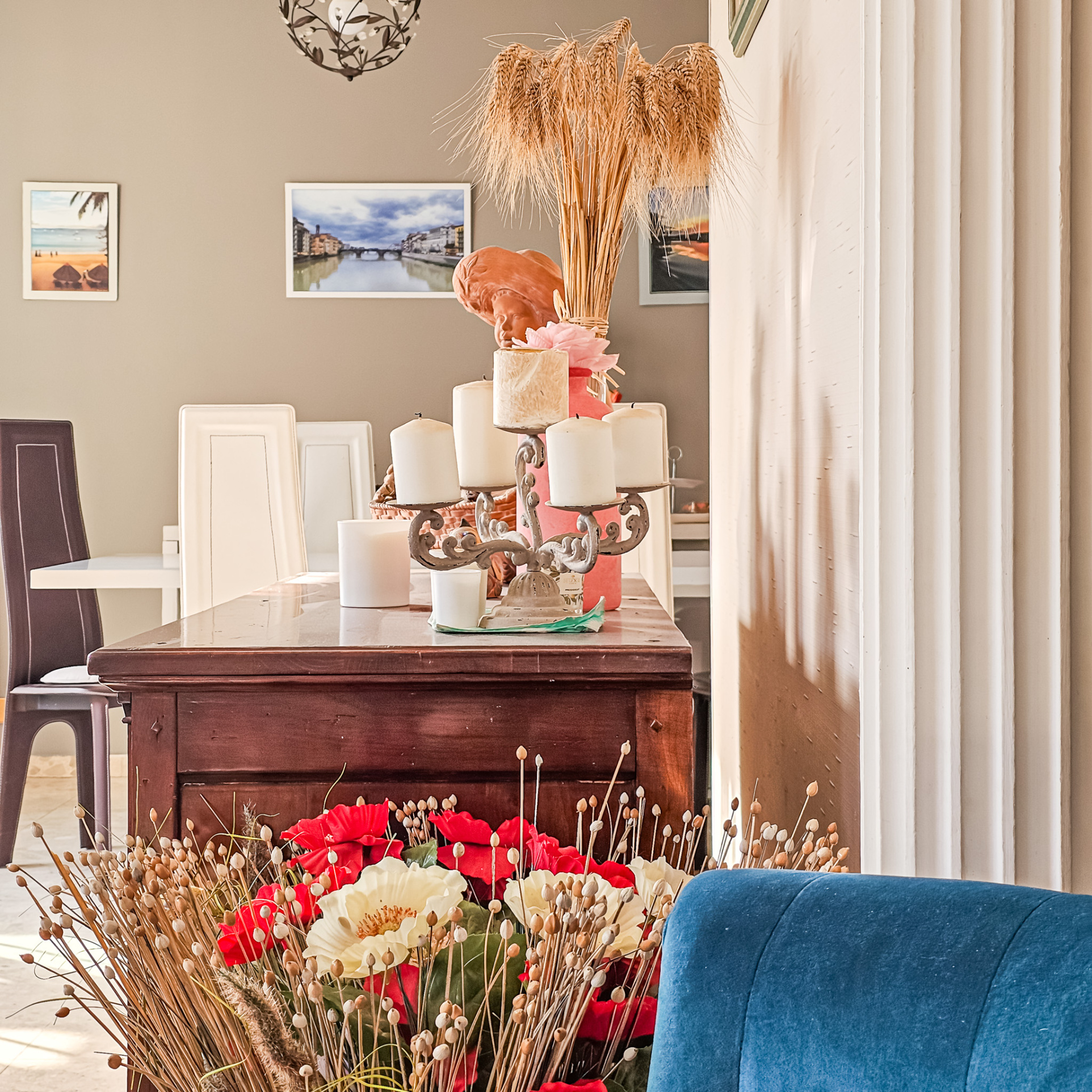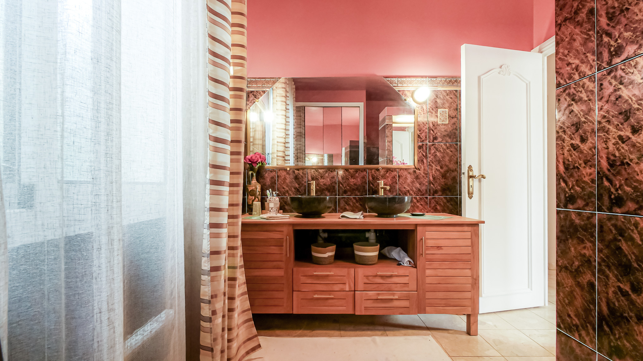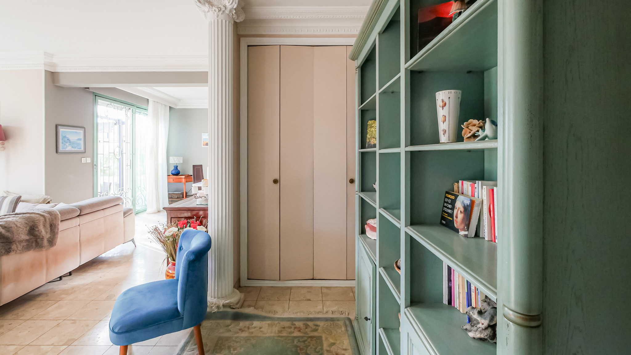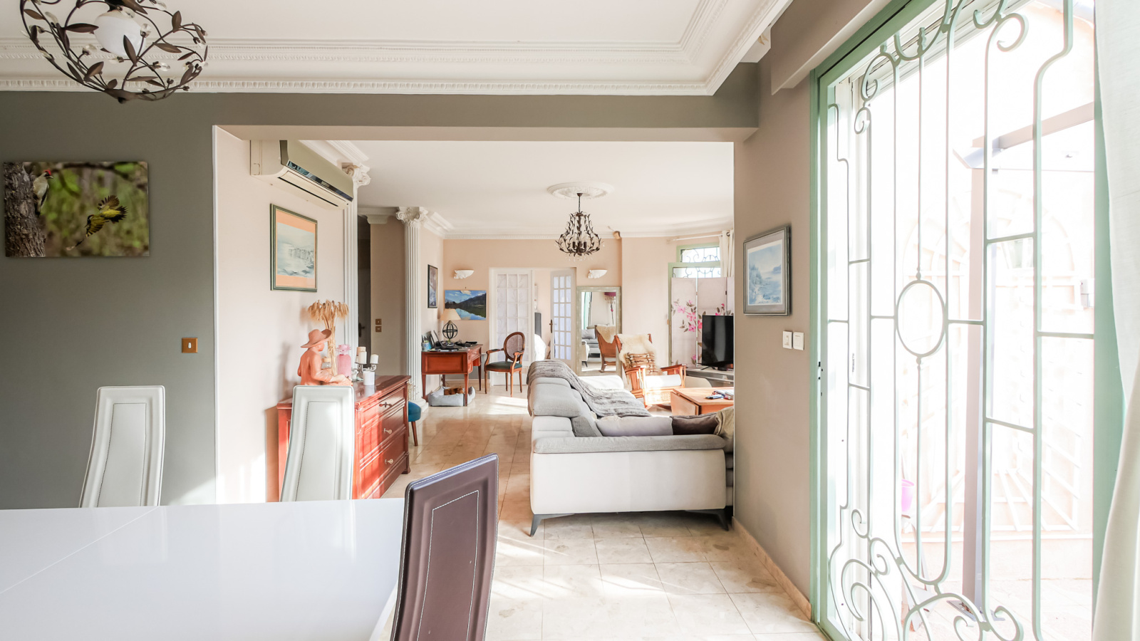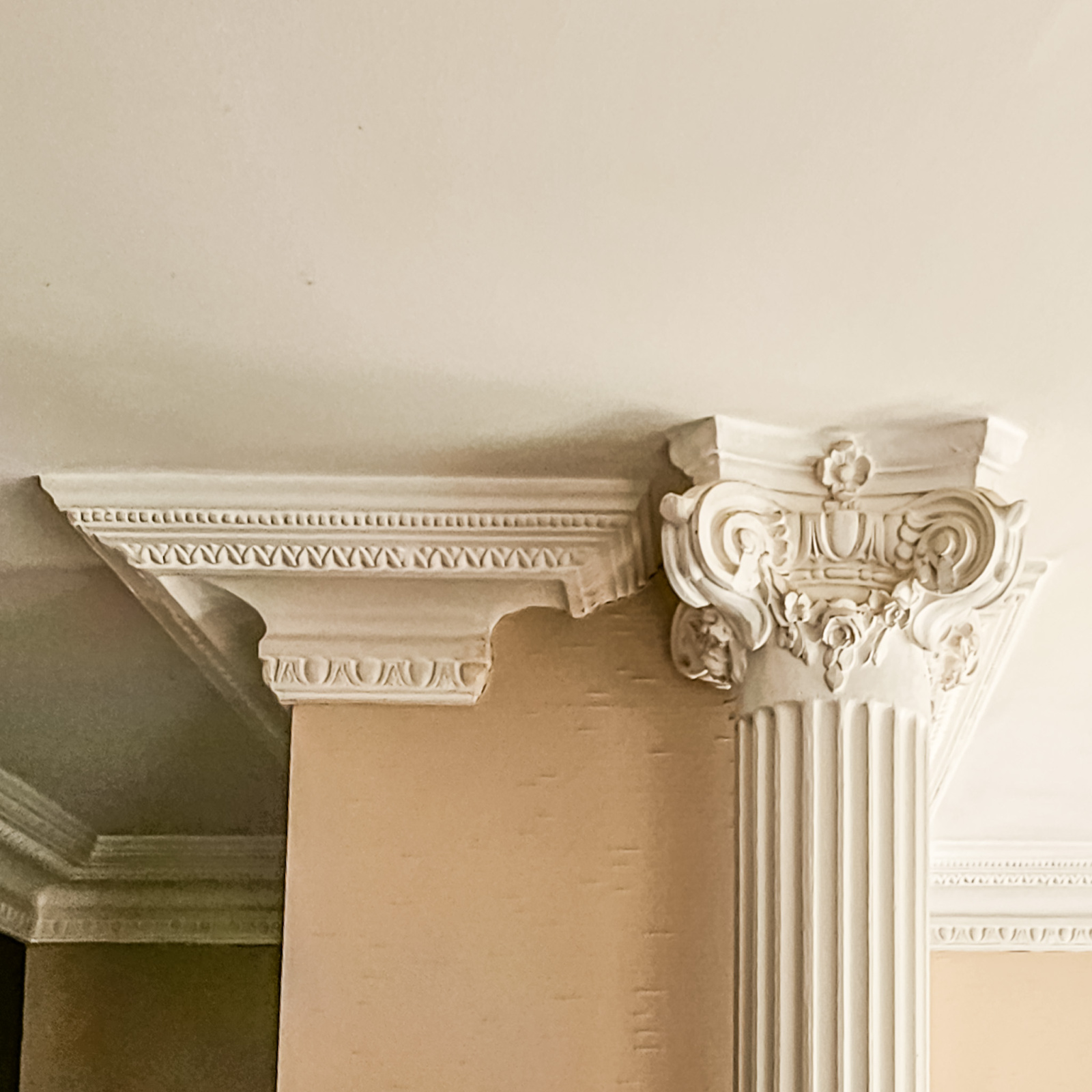Colonnes, ferronneries décoratives, corniches moulurées, rosaces de plafonds et touches dorées composent une identité forte et immédiatement reconnaissable, tout en s’inscrivant dans des volumes contemporains.