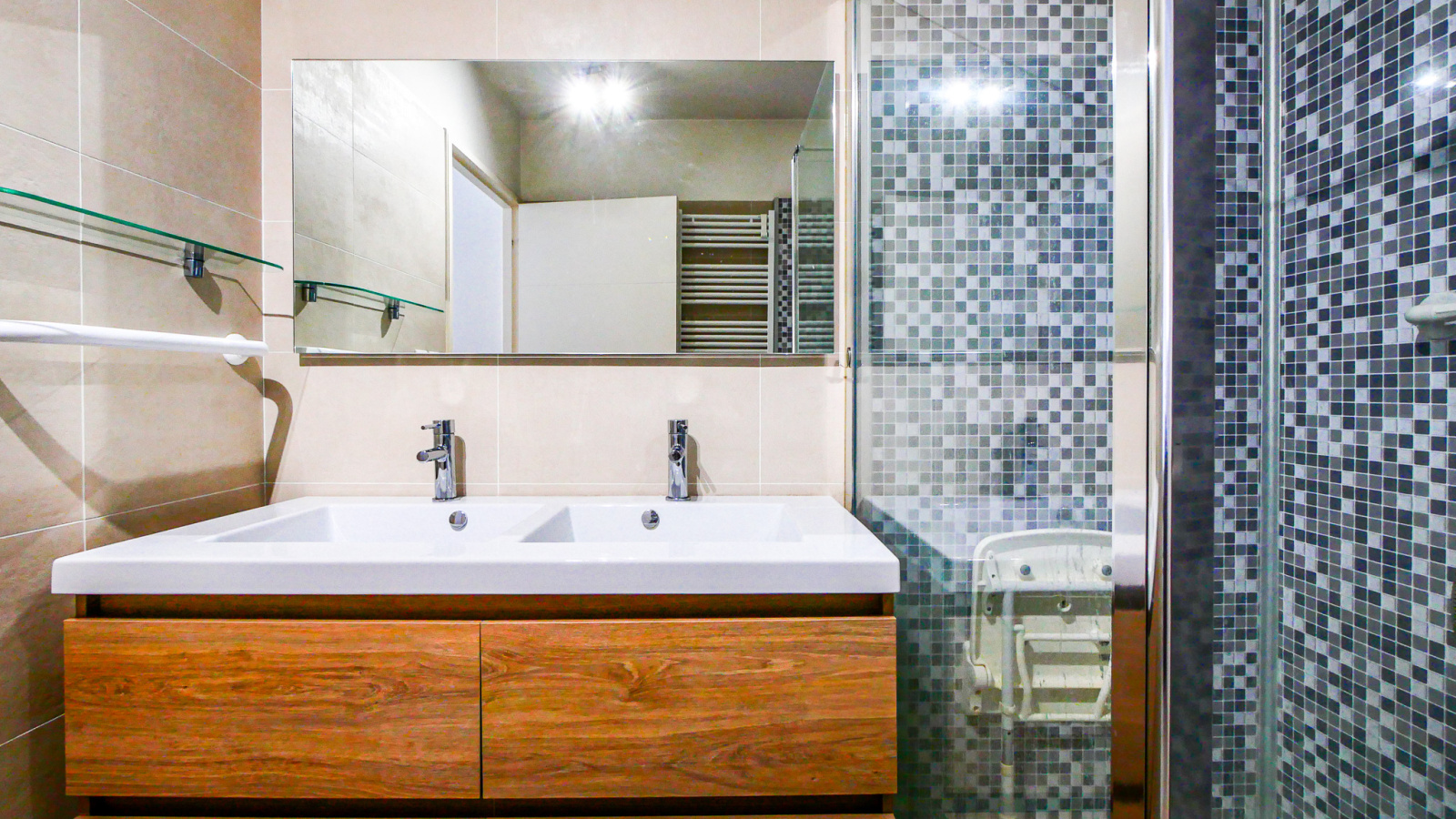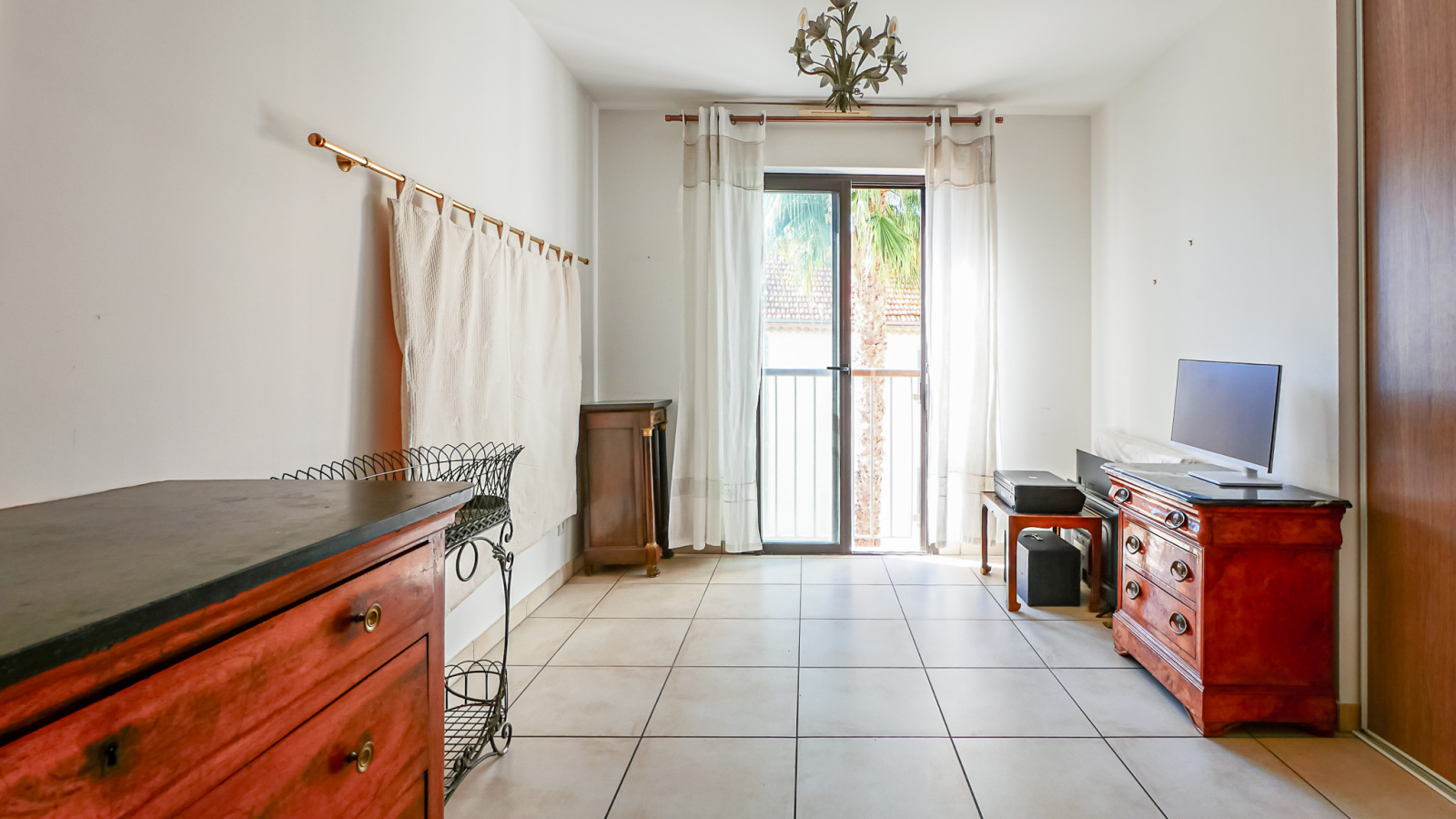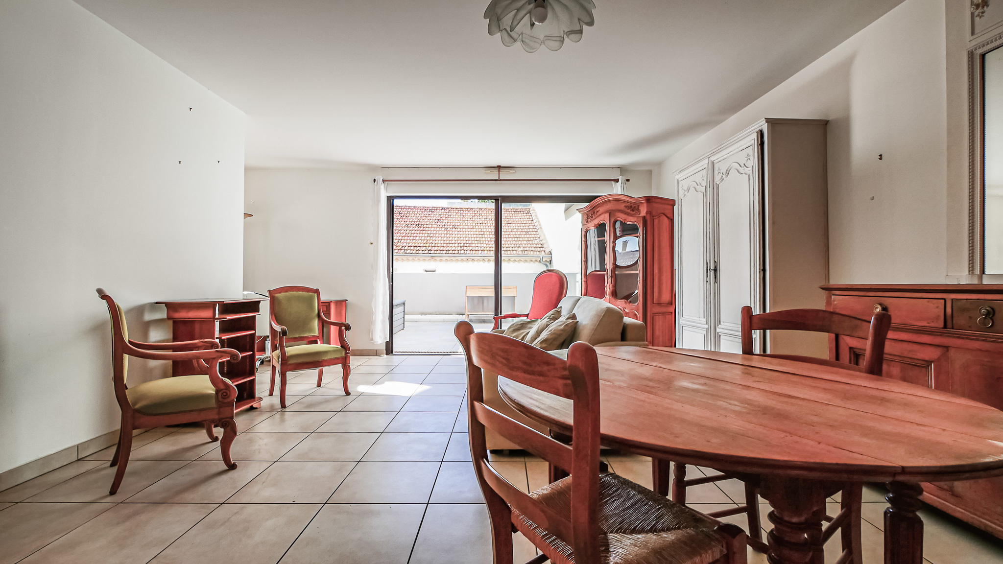 L'appartement offre une grande pièce à vivre lumineuse avec cuisine américaine équipée, ouvrant sur une terrasse en plein ciel de 23 m² abritée du mistral. Le bien dispose de deux chambres avec placards, dont une suite parentale avec salle d'eau privative, une seconde salle d'eau, WC séparé, et un dégagement. Les prestations sont de qualité : climatisation réversible gainable, volets et store électrique, norme PMR dans tout l'appartement, eau chaude individuelle, eau froide incluse dans les charges avec compteur individuel.