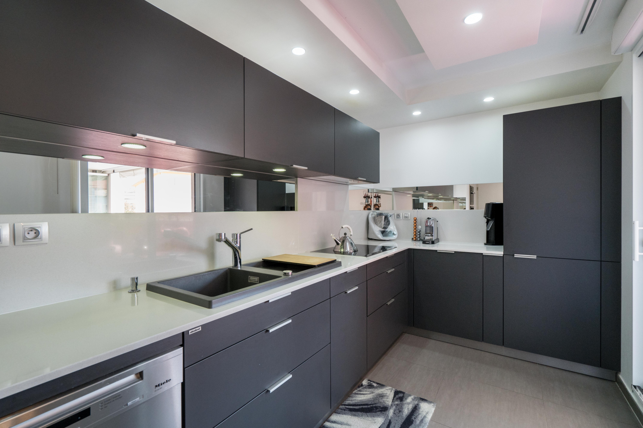 - Une cuisine aménagée et équipée de fabrication allemande Allmilmö, équipée d’électroménager Miele, d’un plan de travail en marbre, l’ensemble réalisé sur mesure ;