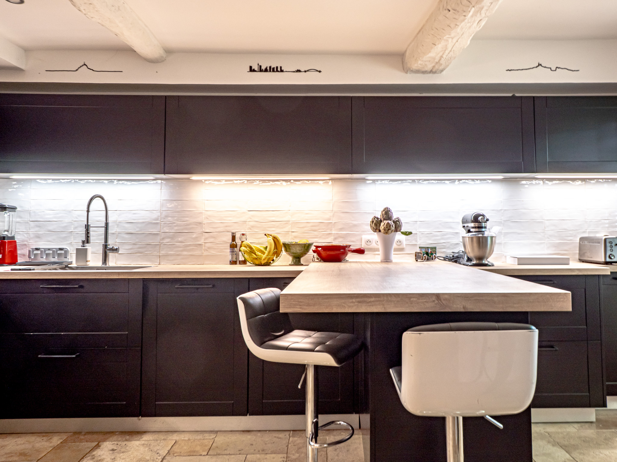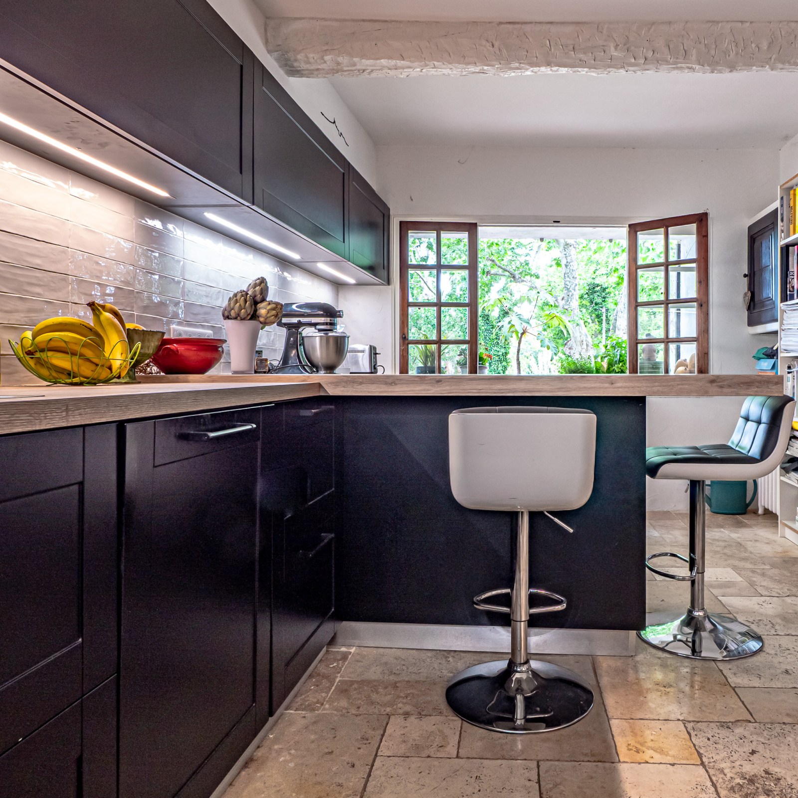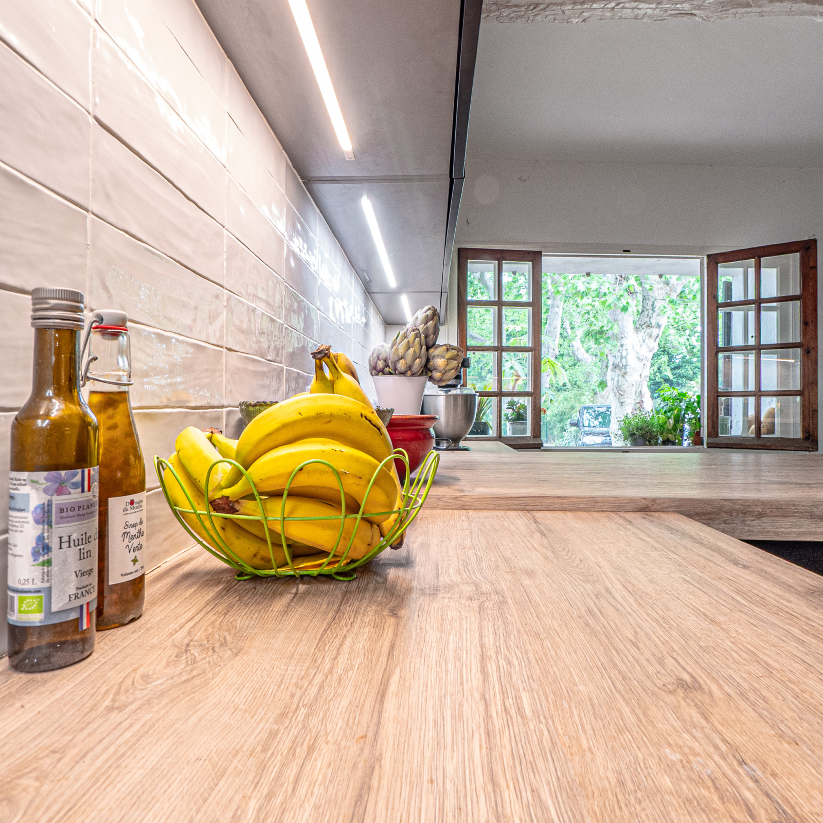 Développant environ 150 m² habitables (169 m² utiles auxquels s’ajoutent diverses dépendances), la maison propose une vie de plain-pied confortable. L’espace s’articule autour d’une cuisine dinatoire sur mesure, conçue par La Maison des Architectes, d’un séjour cathédrale agrémenté d’une cheminée, d’une chambre, ainsi que d’une salle d’eau avec WC.